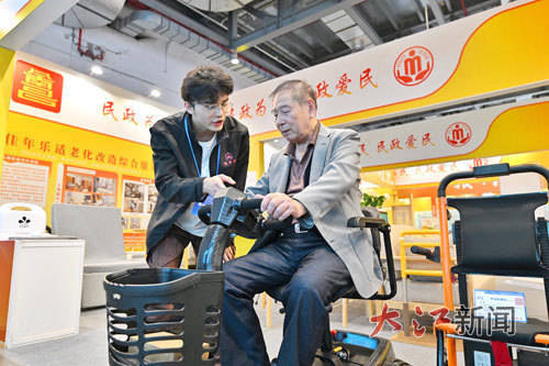 11月8日,一名老年人(右)在博览会上体验选购产品。 江西日报全媒体记者 王蕴蓉摄